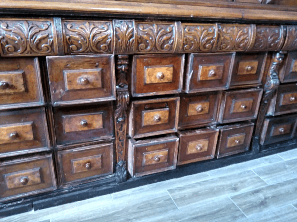 Но то, что это не простая аптека, становится понятно сразу с порога. Все из-за интерьера. Его основу составляют уже упомянутая нами старинная мебель. К примеру, стеллажи стоят на этом месте еще со времен открытия. А это было более 100 лет назад, помните? Стеллажи только отреставрировали, так что атмосферу прошлого они передают на все 200%.