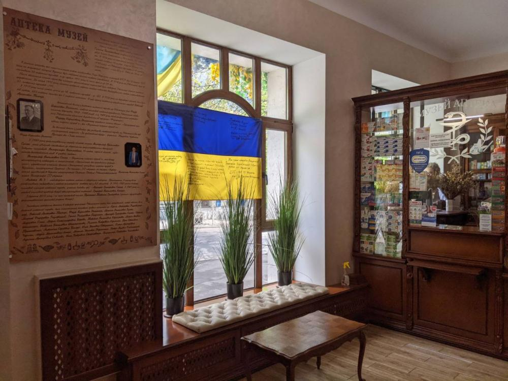 А еще окна ровенского музея-аптеки украшают украинские флаги, лично подписанные военными ВСУ.