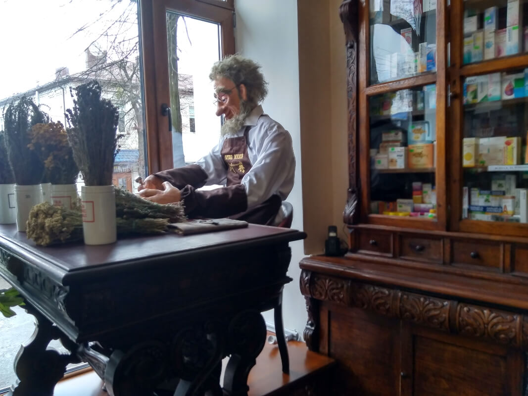 Манекен фармацевта изготовили мастера Ровенского областного театра кукол специально для музея, чтобы это стало еще одной изюминкой заведения. Мол, работал здесь 100 лет назад, пусть работает и сейчас. Но тогда как фармацевт, а теперь – как привлекательность для туристов и гостей аптеки.